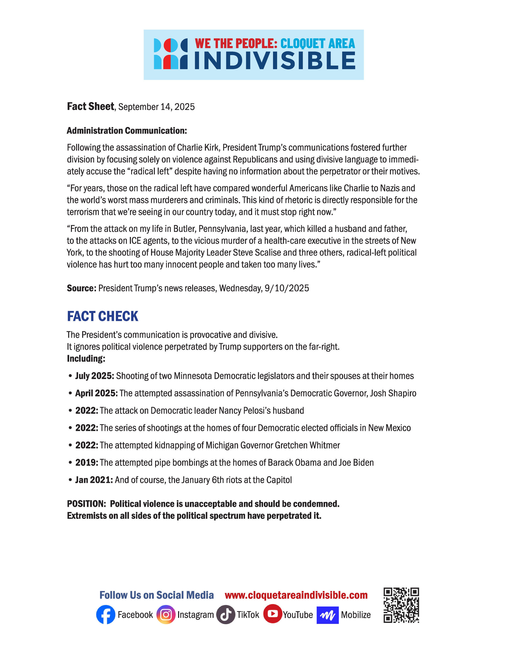 We The People: Cloquet Area Indivisible is a local chapter of the national Indivisible movement—a grassroots network committed to defending democracy and building a more just, inclusive future for all. Based in Cloquet, Minnesota, we are a volunteer-powered group working to increase civic engagement, raise political awareness, and promote progressive policies at the local, state, and national levels.Our mission is rooted in the belief that real, lasting change begins with informed and empowered communities. We create opportunities for everyday people to take part in the democratic process—whether by making calls to elected officials, organizing community events, registering voters, or standing in solidarity with movements for justice and equity.We actively spotlight the issues, policies, and candidates that align with our values: protecting voting rights, ensuring access to healthcare, addressing climate change, advancing racial and economic justice, and resisting the rise of MAGA extremism and authoritarianism in American politics.Through education, outreach, and collective action, we aim to strengthen democratic institutions, support compassionate leadership, and ensure that government remains by the people and for the people—right here in northern Minnesota and across the country.